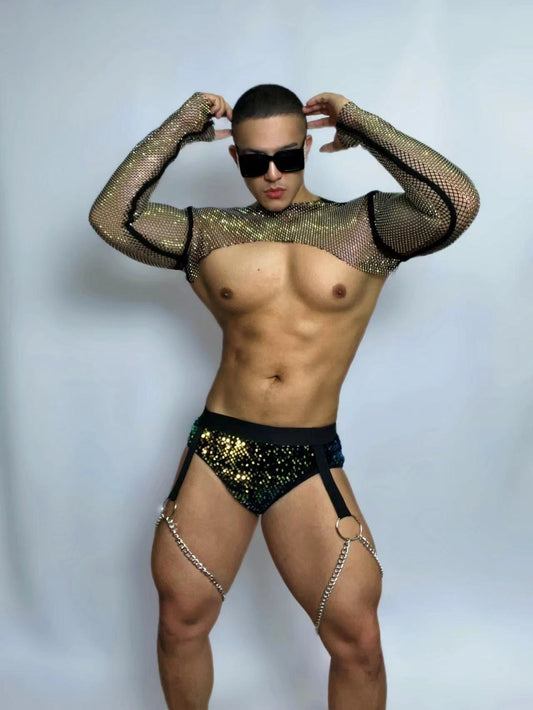 RHINESTONE MESH CROP TOP AND BRIEFS MALE GOGO COSTUME
