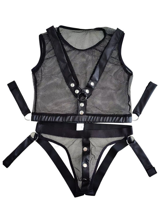 MEN’S LEATHER BONDAGE MESH CROP TOP AND BRIEFS