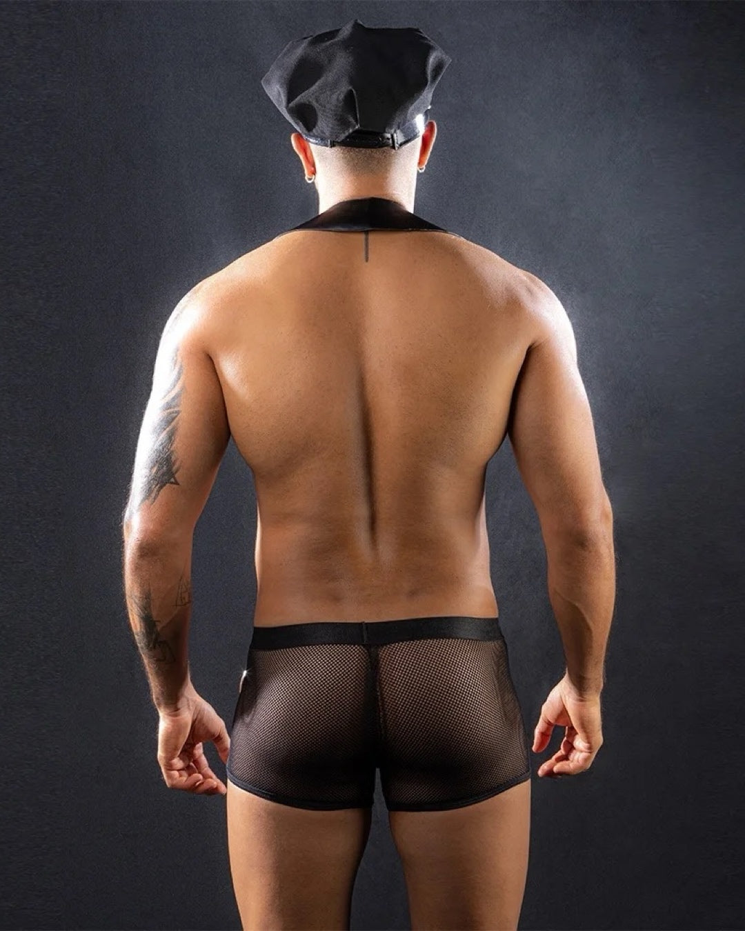 Introducing men's Cop fantasy leather costume is made from polyester, cotton and PU leather materials with one size fit all design. Ideal for Bedroom Role play sessions, Gogo performance wear, circuit party wear, Halloween cosplay costumes, etc. This men’s fantasy costume includes a leather suspender , cap and matching mesh boxer.