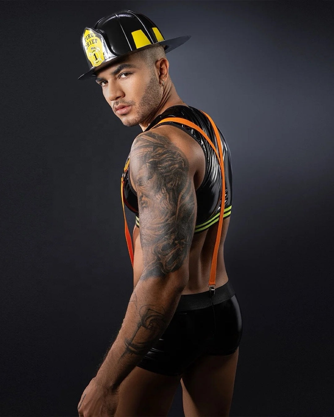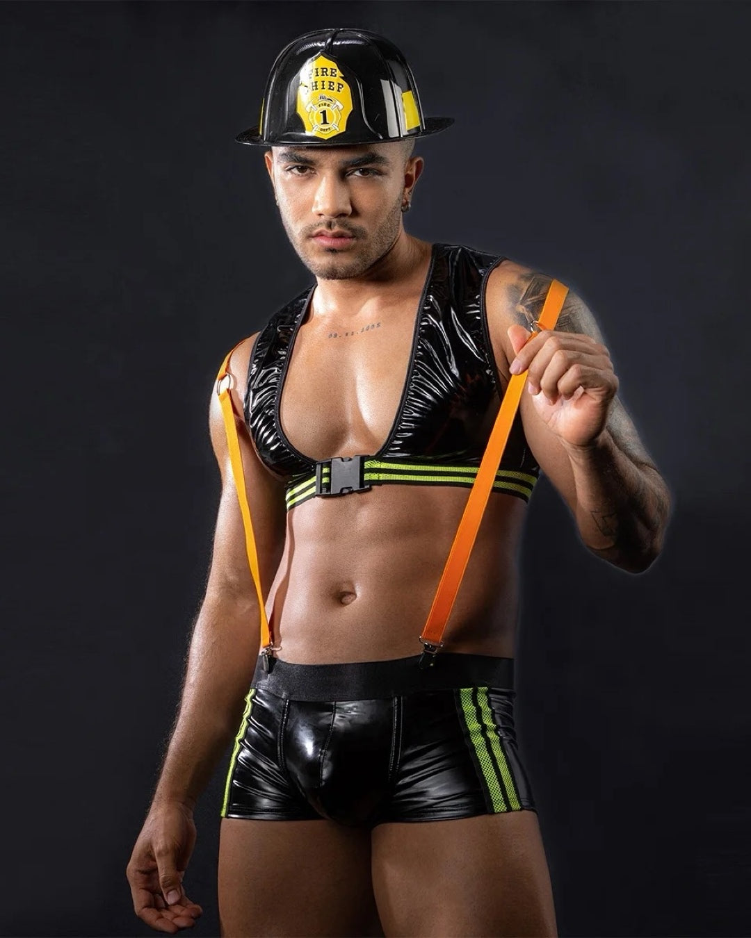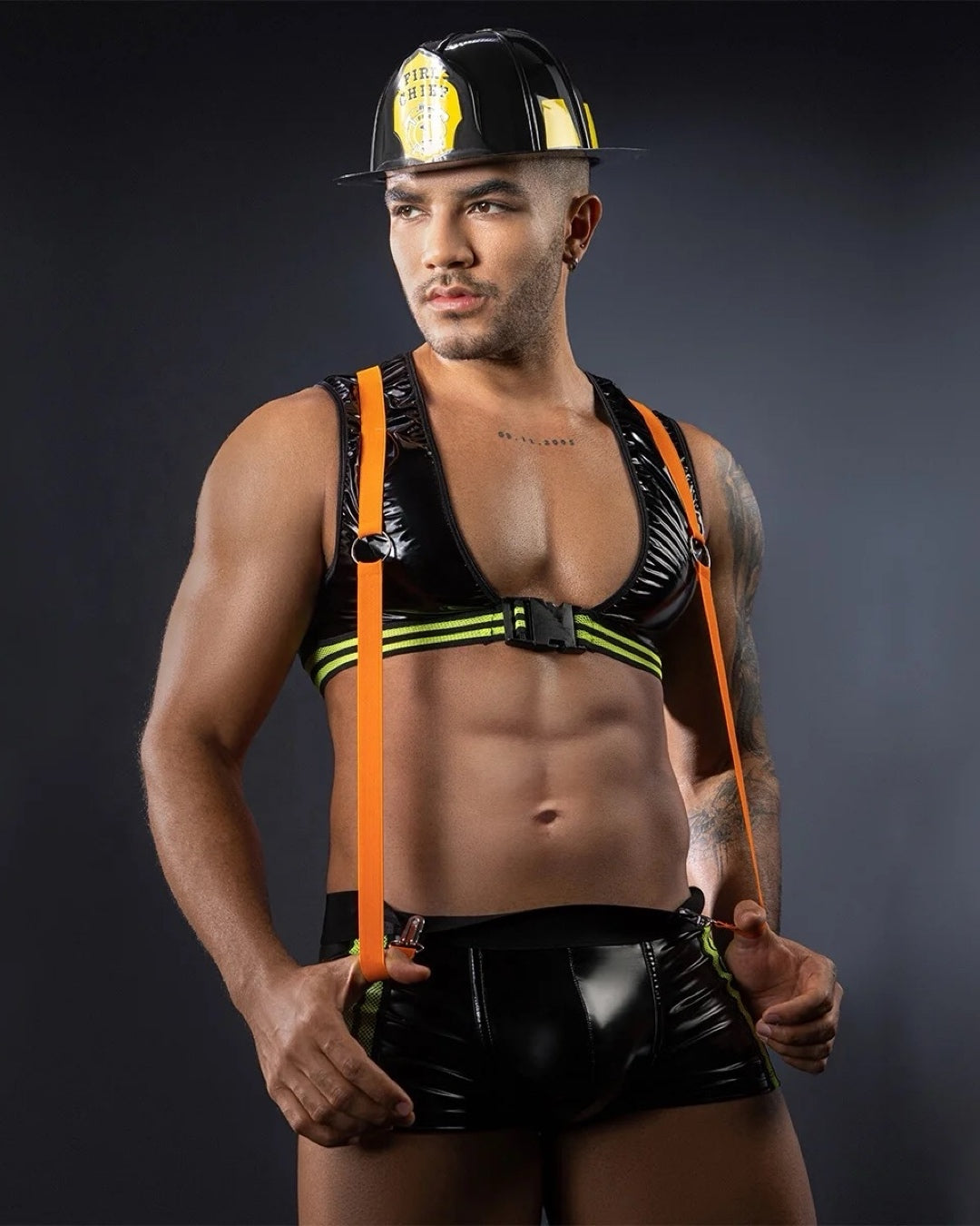 Introducing men's Fireman fantasy costume is made from polyester and cotton materials with one size fit all design. Ideal for Bedroom Role play sessions, Gogo performance wear, circuit party wear, Halloween cosplay costumes, etc. This men’s fantasy costume includes a top wear, helmet and a matching boxer.