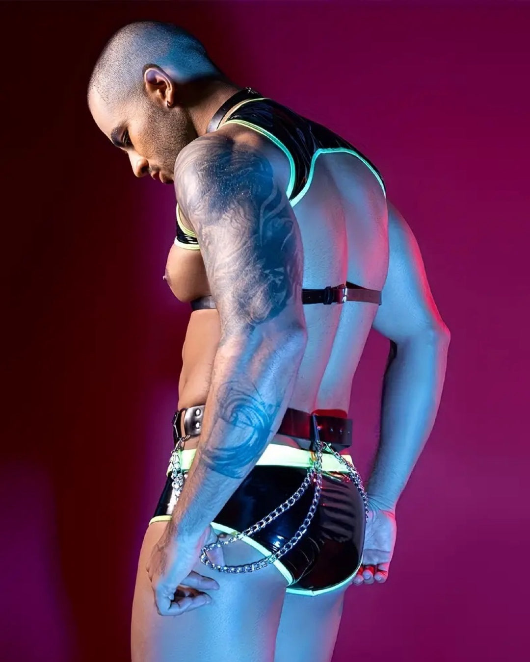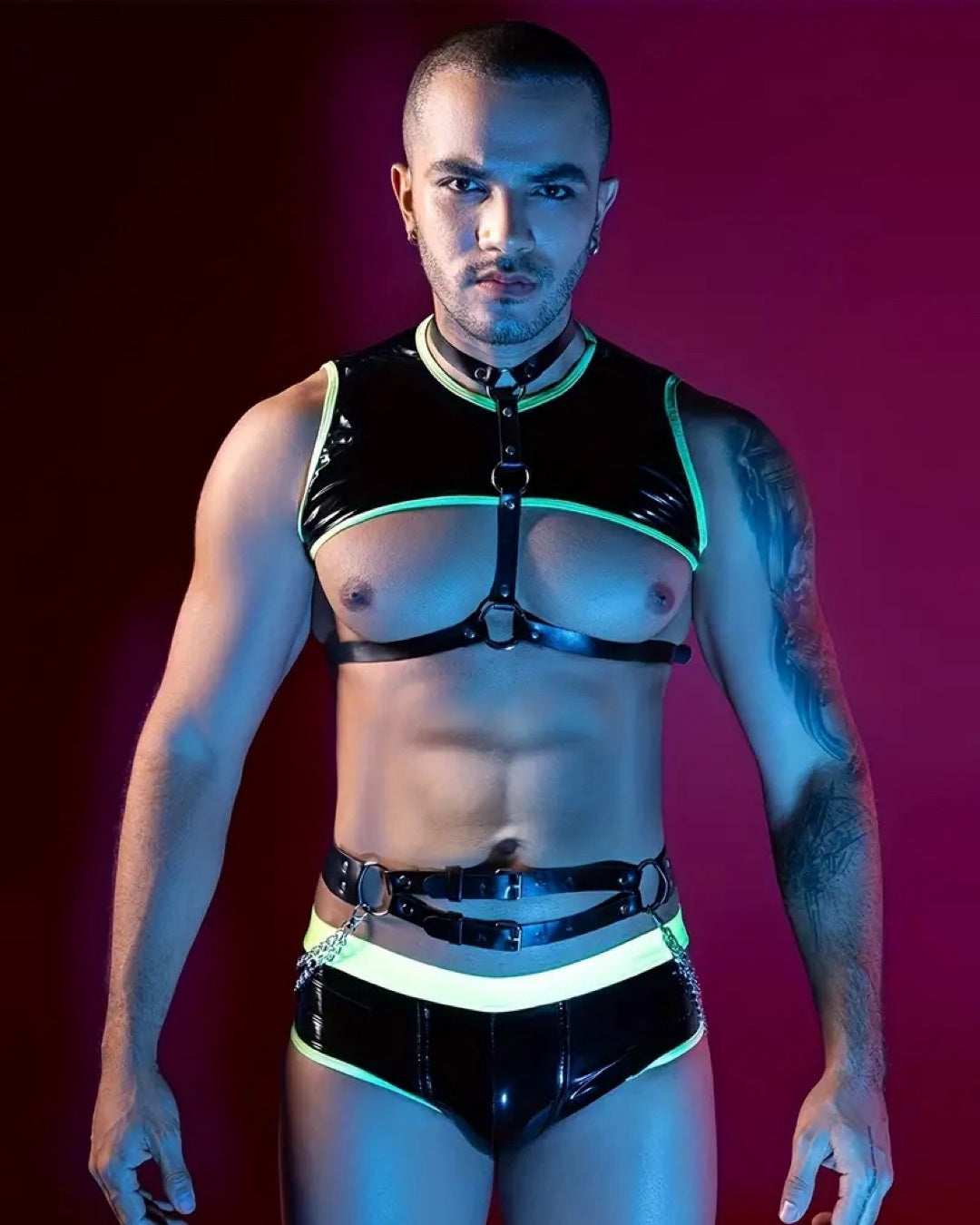 Introducing men's Gogo Boy fantasy leather costume is made from polyester , cotton and PU leather materials with one size fit all design. Ideal for Bedroom Role play sessions, Gogo performance wear, circuit party wear, Halloween cosplay costumes, etc. This men’s fantasy costume includes crop top , chest harness , waist harness and matching boxer.